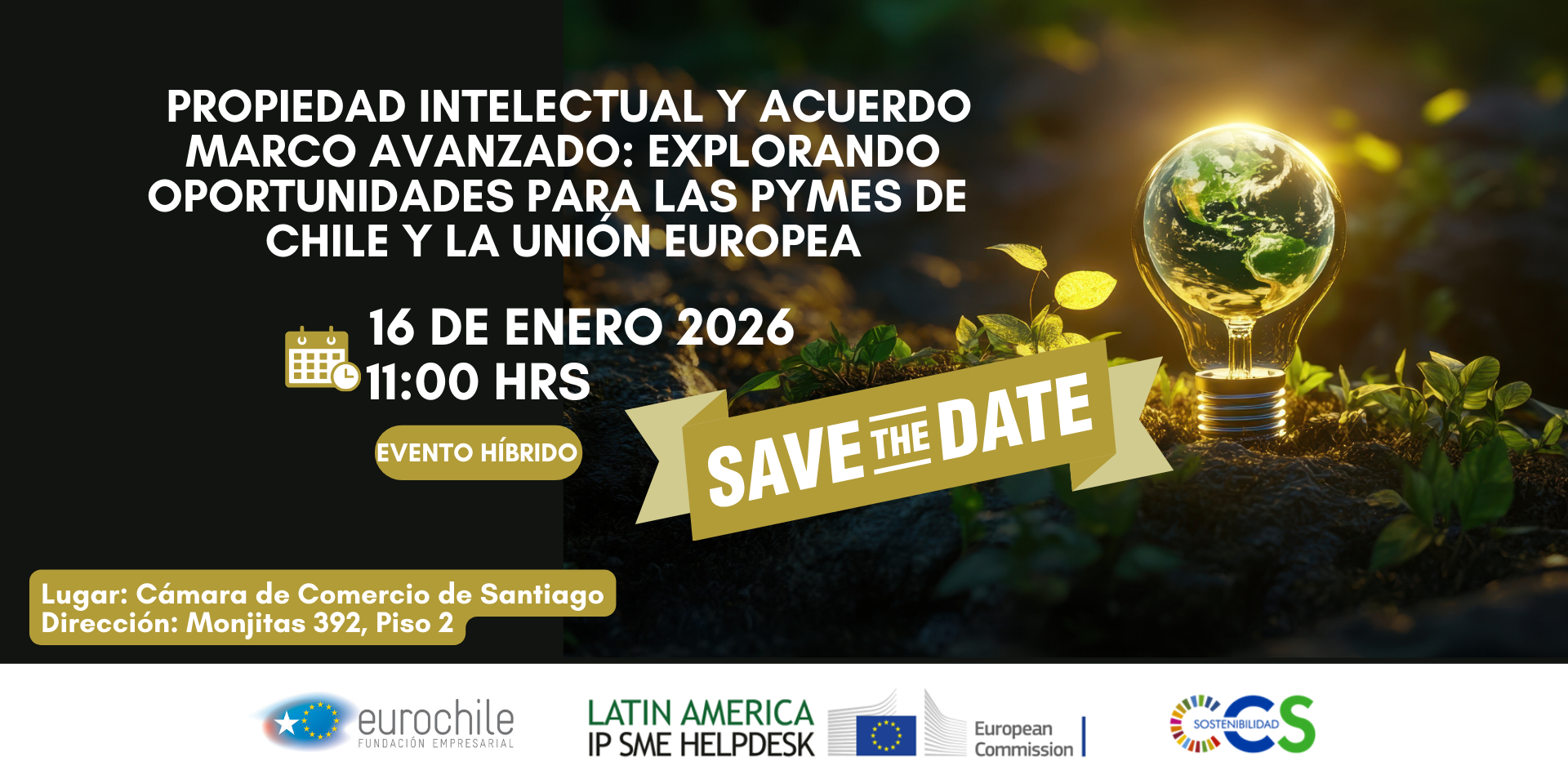 Fundación Empresarial Eurochile, el Latin America IP SME Helpdesk, junto con la Cámara de Comercio de Santiago invitan al Seminario Internacional “La Propiedad Intelectual y el Acuerdo Marco Avanzado: Explorando oportunidades para las pymes de Chile y la Unión Europea”, que tendrá lugar el 16 de enero de 2026 en la sede de la Cámara de Comercio de Santiago, Monjitas 392, piso 2.